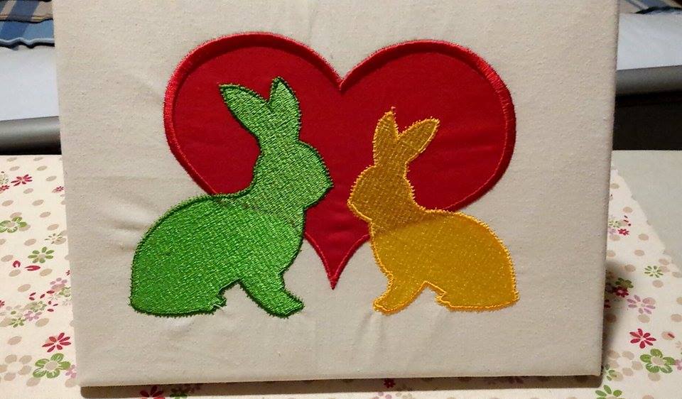 2 süsse Häschen. Das Herz kann als Applikation gestickt werden.Es handelt sich hierbei um eine Datei für Deine Stickmaschine, nicht um ein fertig gesticktes Produkt. Für Wünsche bezüglich weiterer Grössen oder fertig gestickten Produkten kontaktiert mich bitte per email,