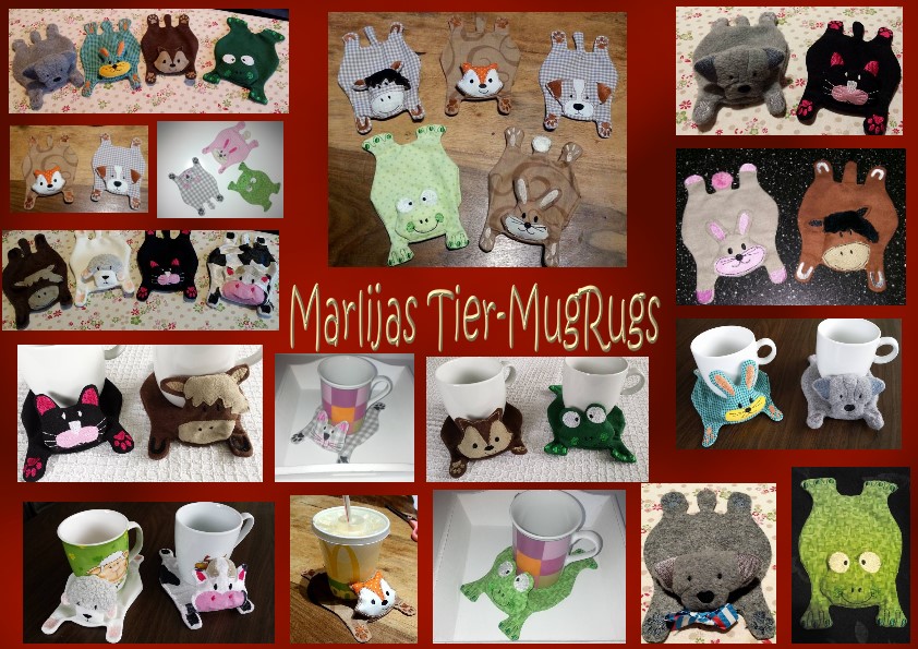 8 verschiedene MugRugs komplett ITH gestickt mit süssem 3D Köpfchen